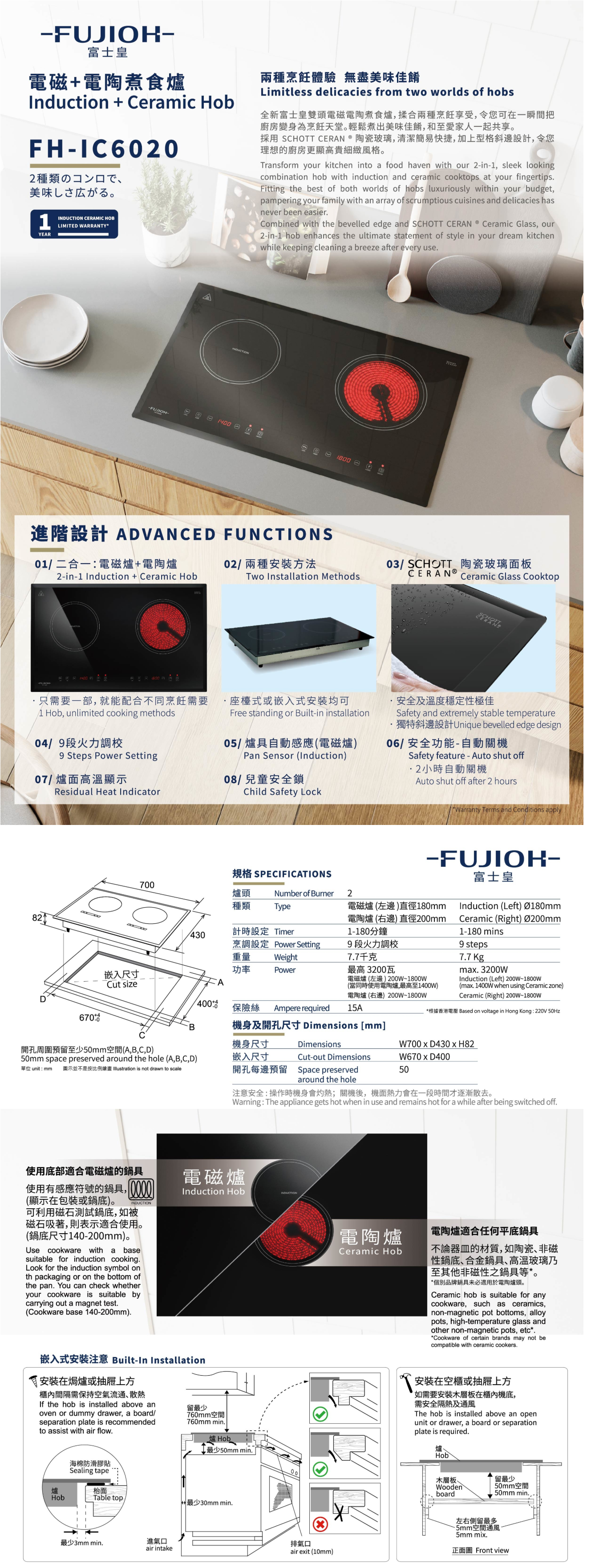 Fujioh 富士皇 FH-IC6020 70厘米 嵌入式電磁及電陶爐